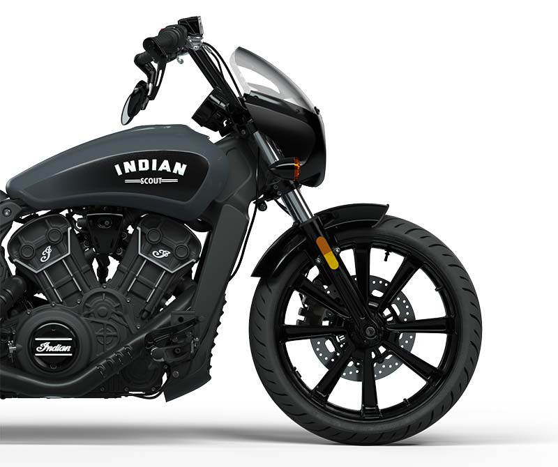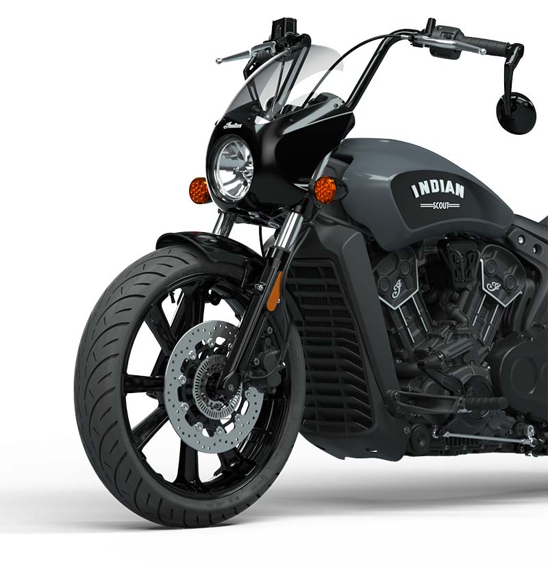 La roue avant de 19 pouces accentue le style et les lignes épurées de la Scout Rogue et procure une grande maniabilité sur tous types de routes.